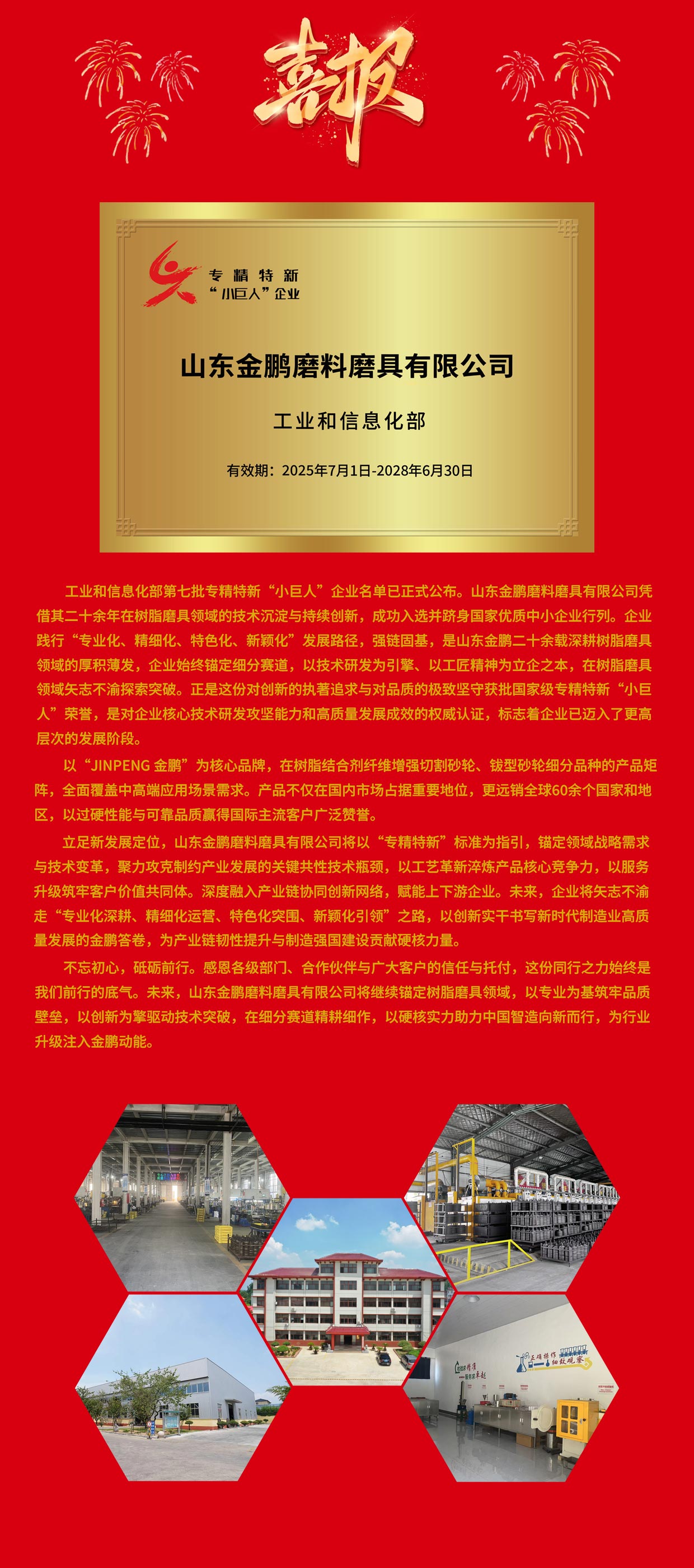 喜报|山东金鹏磨料磨具有限公司荣获国家级专精特新“小巨人”企业称号!